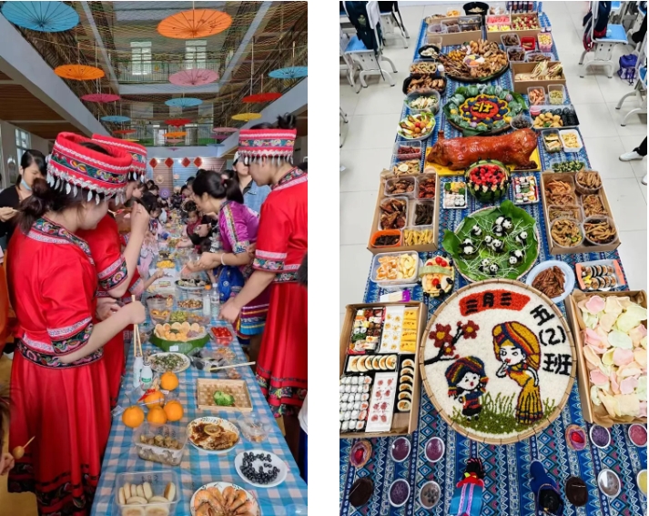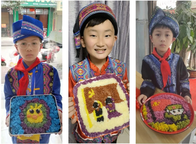 “長桌宴”又稱合攏宴,是侗族、苗族、瑤族等多個民族的風(fēng)俗習(xí)慣,常用于接親嫁女、滿月酒、村寨聯(lián)誼等宴飲活動,代表最為隆重的待客禮俗,已有幾千年歷史。“長桌宴”上有壯族特色的五色糯米飯、艾葉糍粑、壯粽,苗族的傳統(tǒng)佳肴,還有黎族的三色飯……一份份美食造型美觀、色彩鮮艷、香味撲鼻。圖為集團(tuán)職工拍攝的孩子參加學(xué)校“三月三”活動。